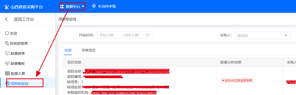登录政采云平台,进入“数据中心-招投标巡检”。