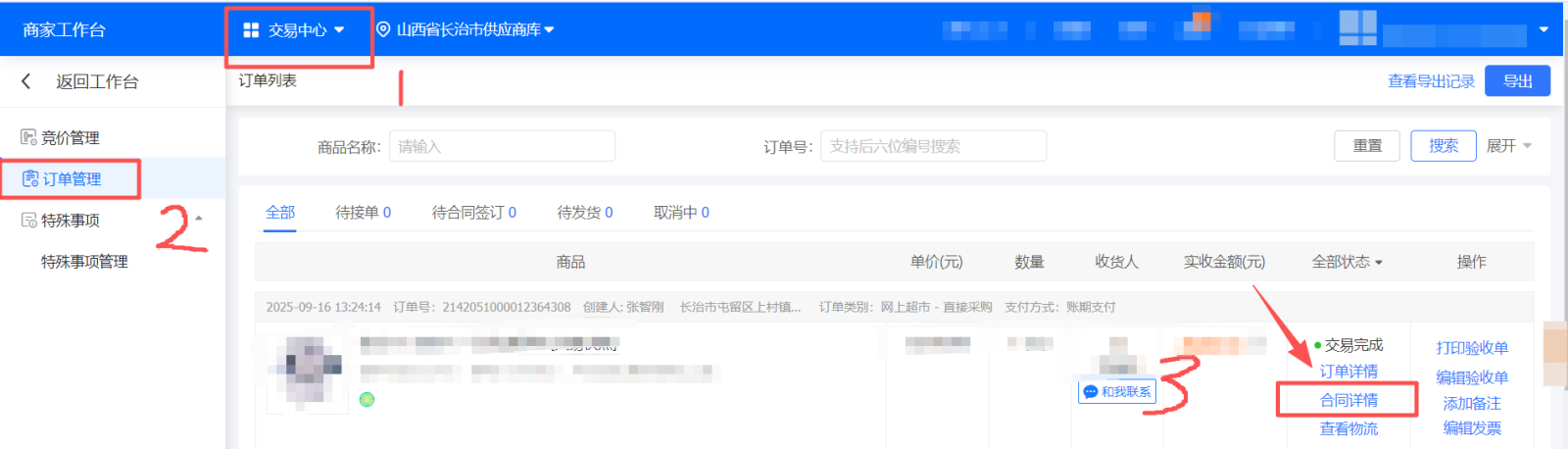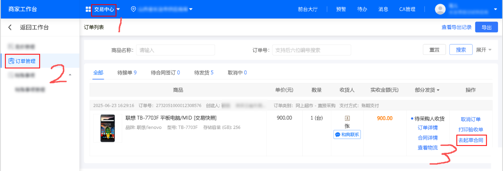1. 在供应商后台交易中心“订单管理”页面,找到对应订单,点击“去起草合同”