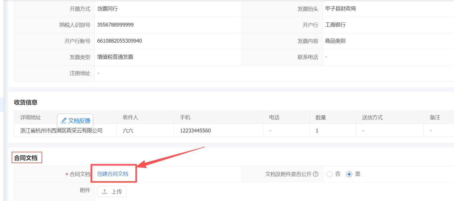 3. 在最底部合同文档,选择是否CA签章以后,点击“创建合同文档”,提示:如果选择CA签章供应商和采购人都必须提前通过右上角“CA管理”进行绑定以后,再进行CA线上签章。