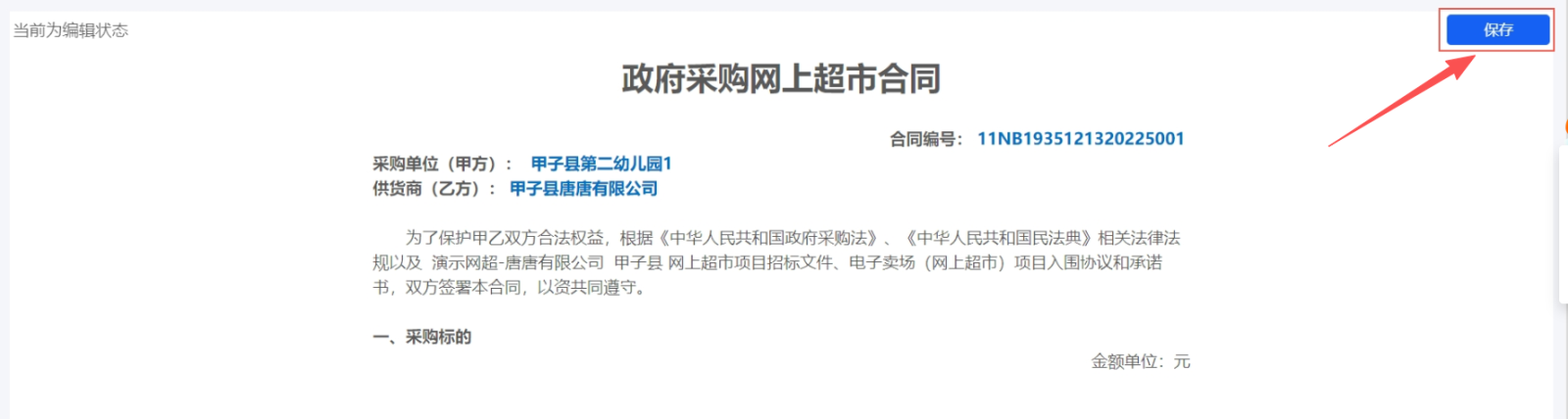 2. 在打开的页面,填写合同基本信息、供应商信息、发票信息等红色必填项,提示: