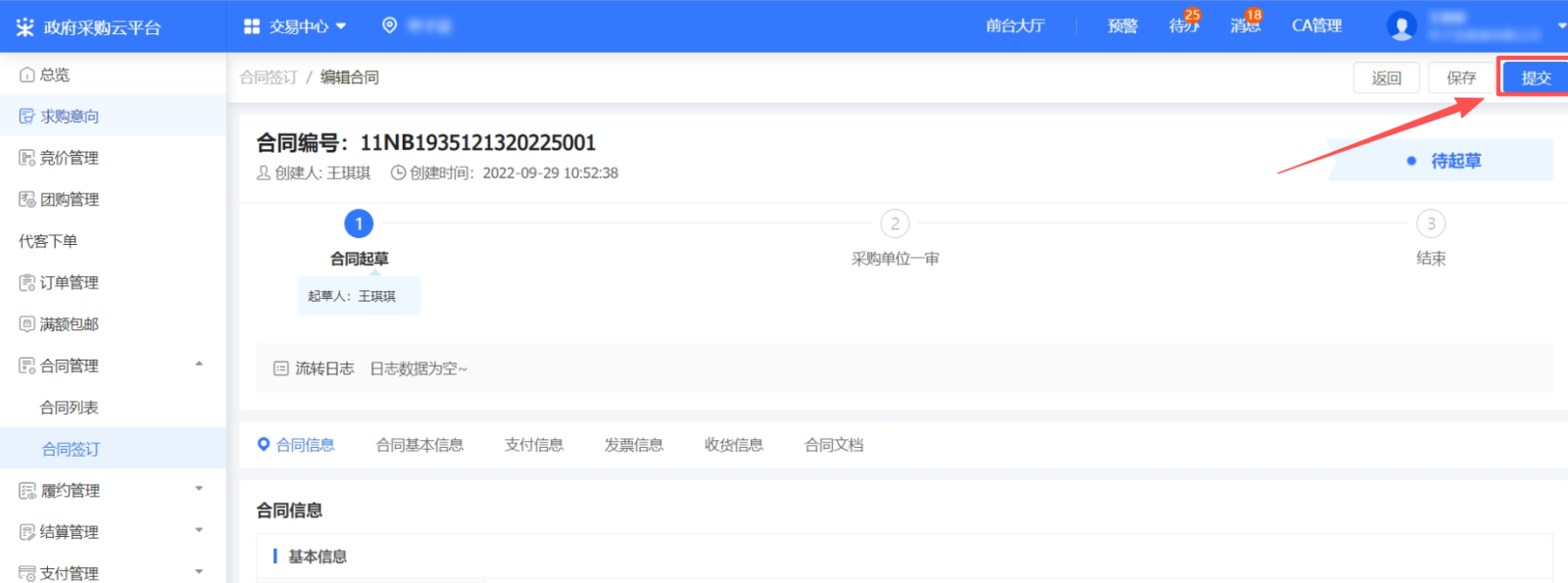 5. 确认合同信息无误后,点击右上角“提交”,并选择审核人,审核流程:一审是供应商内部审核,二审采购人进行审核。