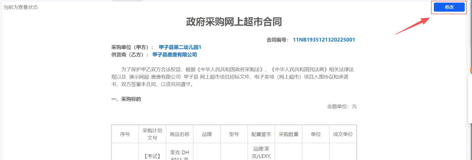4. 在合同页面,点击“修改”,合同相关信息可编辑。合同信息维护后点击“保存”,关闭当前页面。